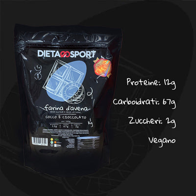 - Farina d'avena finemente macinata aromatizzata cocco e cioccolato